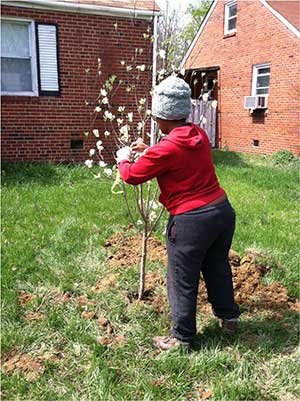 Based on the success working with Ron, the GIC partnered with the hospital’s work force re-entry and counseling program to create a green jobs training program for disabled veterans (see photos of class and field trainings). In 2015, the Dominion Foundation, the Virginia Department of Forestry and the Alliance for the Chesapeake Bay provided the GIC with a grant to plant more trees and hire disabled veterans to become the project’s ‘urban foresters.’ The goal was to help both people and nature heal and to help veterans regain their place in the civilian workforce, following their struggles with homelessness, addiction and Post Traumatic Stress Disorder, as well as physical disabilities suffered in wartime. The GIC hired a social worker, Teri Frazier, and an urban forester, Lara Johnson, to manage the project.